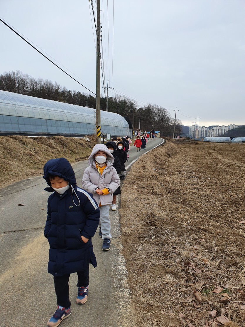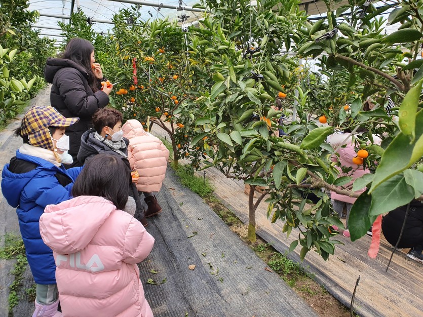 코로나로 바깥 나들이가 쉽지않았던 유치원친구들이 춥고 눈발 날리는 시골길을 걸어도 보고 맛난 천혜향도 따보고 맛보고 행복한 시간을 보냈답니다~~